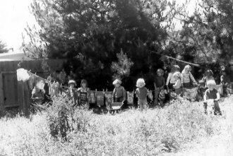 This black and white photograph shows a long clothesline with tie dye garments hanging from it. Nearby, in front and behind the line, are a dozen or so children, some holding up tie dye shirts. There is high grass in the foreground and trees in the background.Collection