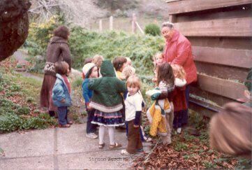 Woman in pink jacket (Elizabeth Terwillinger) talks to the children grouped around her on the back patio of the community center along the fence.Collection