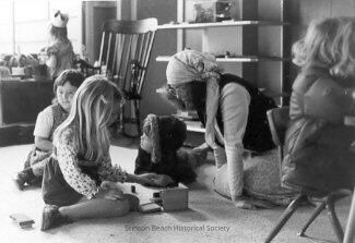 This black and white photograph shows three children and an adult engrossed in a project on the floor. The children are from left to right Harmony Lichtenwalner, Rebecca Zell and Dan Harrington. The adult is teacher Susan Tacherra. There are two unidentified children: One standing by a window at the back and one sitting in a chair at the right of the picture.Collection