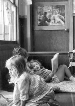 This black and white photo is of three children on the floor. The girl in the foreground (Suzannah Staples) is on her hands and knees. Behind her and mostly obscured by her is another child and beyond these two is a girl lying on a mat looking at a book.Collection