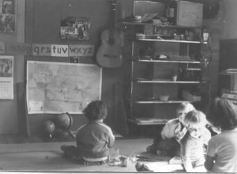 This black and white photo shows four children on the schoolroom floor. In the background is a wall with a map, an alphabet chart and a guitar hanging on it as well as some shelves.Collection