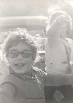 This black and white photo is of a little girl with curly dark hair and glasses smiling at the camera. She is Annie Perry. Behind her another child is pointing at something so that her hand and arm obscures her face.Collection