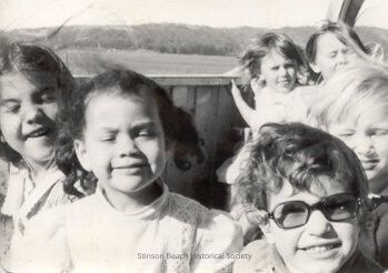 In this black and white photo six children are facing the camera. The girl in the right hand corner, wearing glasses, is Annie Perry. She and the unidentified girl directly behind her are the only ones with their eyes open and the wind is blowing everyone's hair.Collection