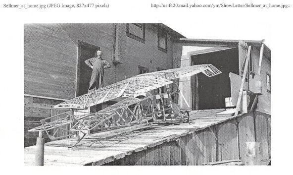 A computer printout of a black and white photograph of Mr. Sellmer who built an aircraft in his house at Calle del Ribera in 1940's. He is standing by the door of his second floor door. An attached shed and a ramp going up to the opening of the shed is built In front of the house and a completed wooden frame of a plane is setting on the ramp. The wings of the plane is detached and sit rotated in the same direction as the fuselage of the plane so that the entire construction could go inside of the shed. Mr. Sellmer 's son Walter Bruno was a local game warden, a sheriff and later in life wrote letters to shut-ins to help cheer them up. The print out has the address, http://us.f420.mail.yahoo.com/ym/ShowLetter/Sellmer_at_home.jpg..Collection