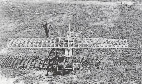 A computer printout of a black and white photograph of completed wooden framing of an aeroplane with the man, Mr,Sellmer, who built it. The plane is setting on the field, more like the lagoon side of beach or field with native grasses. Mr. Sellmer had a son, Walter Bruno who was a local game warden, a sheriff and later in life wrote letters to shut-ins to help cheer them up. The print out has the address, http://us.f420.mail.yahoo.com/ym/ShowLetter/Sellmer_and_plane_1..Collection