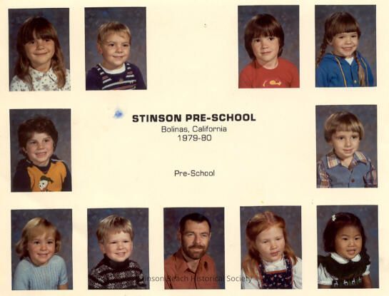 This color print is of ten children and one male adult. The pictures are arranged around the outside of the page and printed in the blank center is 'STINSON PRE-SCHOOL Bolinas California 1970-80 pre-school. The children and the teacher are all unidentified.Collection