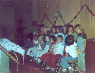 This color photograph shows fourteen children on a stage. Seven of the children are standing and seven are seated on chairs in front of them. Streamers and balloons are tacked to the wall behind the children. In the left hand corner the back of someone holding a guitar is visible.Collection