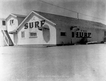 This black and white photograph is of a long barnlike building with stairs at the end nearest the camera which lead up to a smaller attached upstairs apartment. Painted across the end of the building as well as along the side are the words The Surf. There are two doors in the end of the building and one on the side. All the doors have awnings over them.Collection
