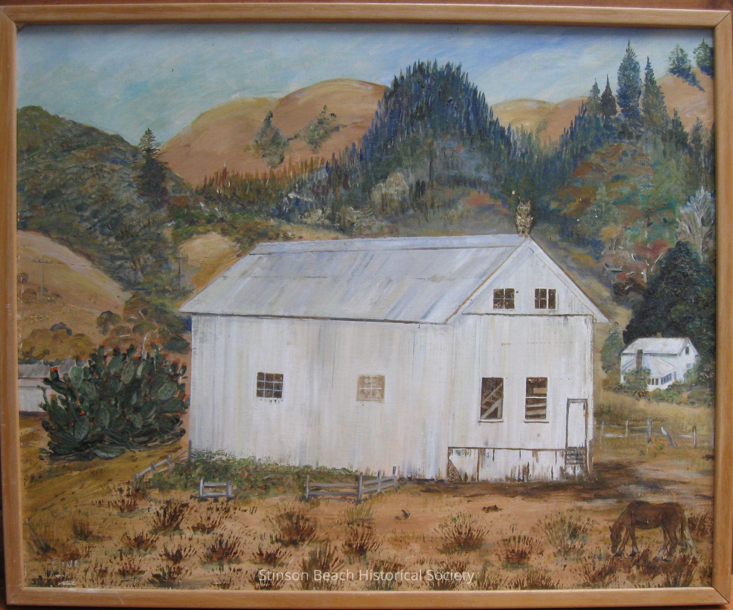Watercolor painting on paper, framed under glass. White wooden barn sitting in a field of dried grass clumps being nibbled on by a brown horse in lower right corner. Another white structure similar to the barn is off in the distance in front a pine tree. There is a large cactus plant on the left of the barn, which partially obscures a small shed. The ground and hillside beyond are mostly brown with copses of green trees and bluish tinged foliage. There are several places around the barn where there are the remains of a wooden fence. There is an owl sitting on the corner of the rooftop. The sky is blue.Collection