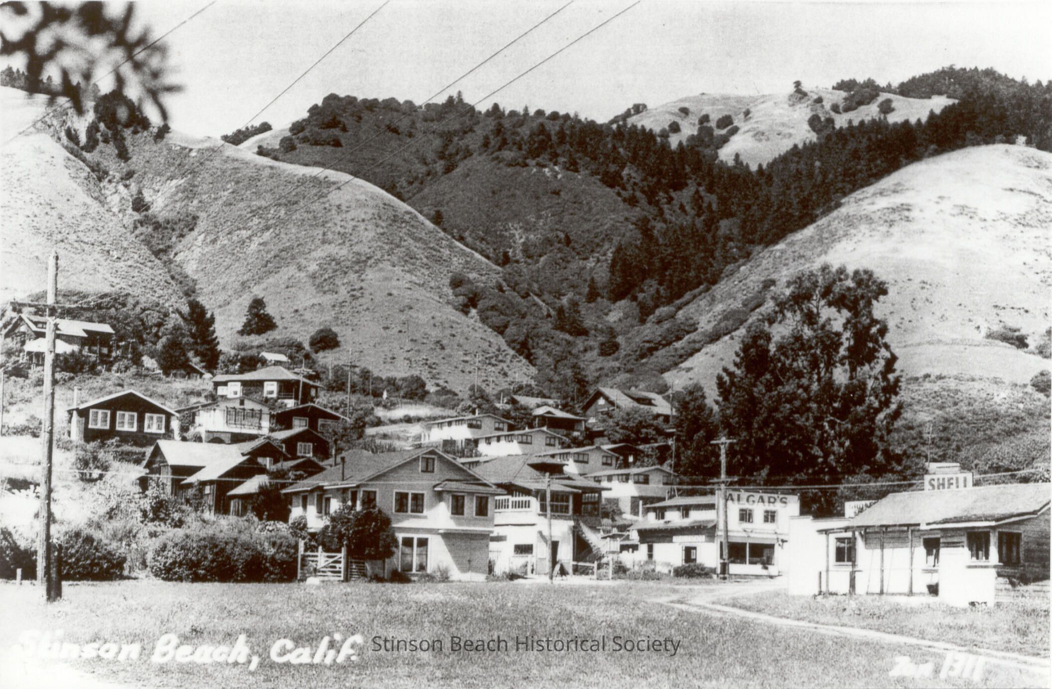 B&W photograph copied from a postcard of the downtown and hill area of Stinson Beach. On the far right is a white building with a Shell sign on the roof. To the left of that is a white 2-story building with Al's Cars painted on the side. Further to the left are two 2-story wooden houses and homes continue up the hillside, which takes up the top half of the photo.Collection