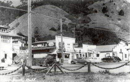 Street scene of downtown Stinson Beach as seen from an empty lot surrounded by a single link barrier fence. Buildings visible include a Real Estate building, The Pelican's Nest restaurant with signs on the building indicating "fountain," "lunch" and Coca Cola. Perhaps part of the same building is a cafe and then the "barn." Several vintage automobiles are parked in front of the buildings and a telephone line crosses the length of the photo.Collection