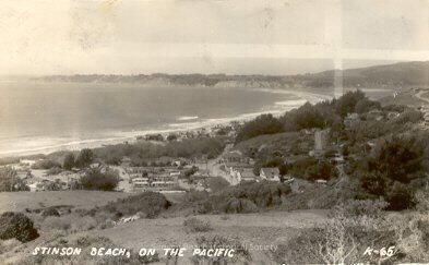 B&W postcard on which is written in white ink "Stinson Beach, On The Pacific" on the bottom and K-65 in the righthand corner. The back of the postcard attributes it as the property of Mary A. Jones. The photo is a panoramic view from the hillside of Stinson Beach, mostly the downtown, and the curvature of Bolinas Bay on a cloudless day.Collection