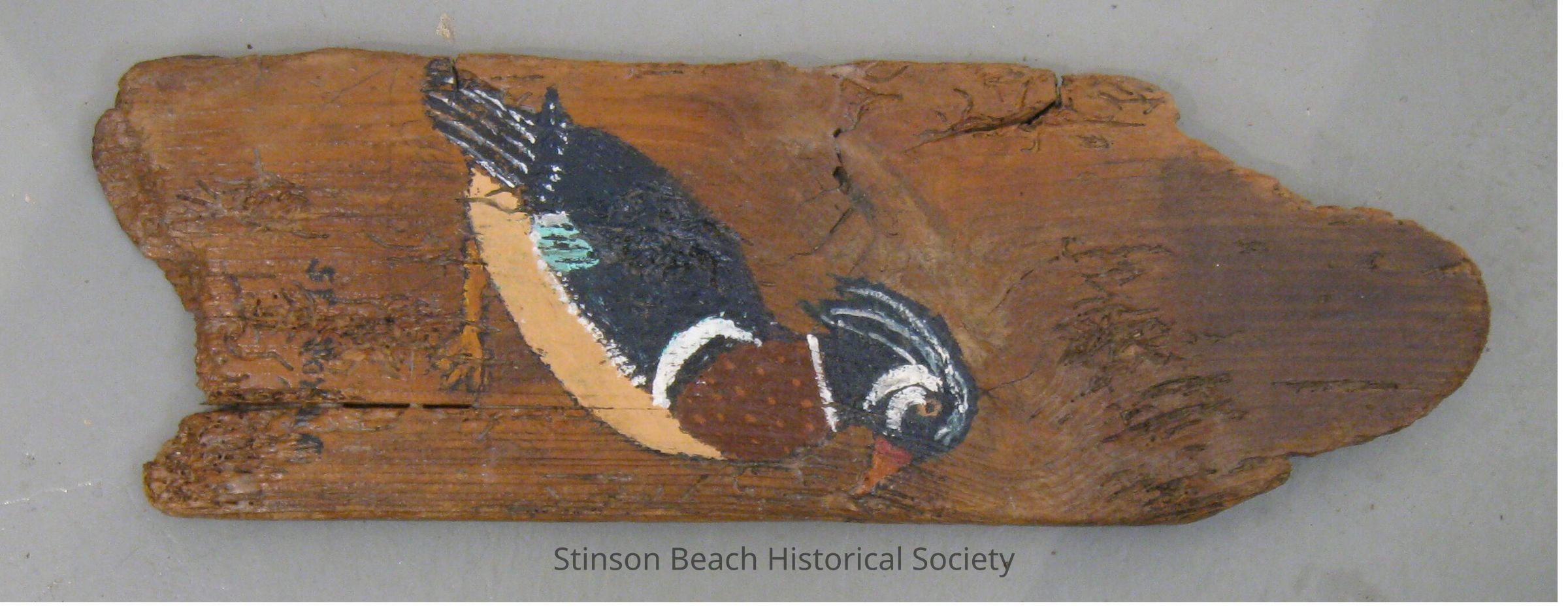 Wood duck seen in profile painted on an oblong piece of driftwood with a protruding rounded top. Duck has a black head with white stripes in the feathers sticking out from the back and a white patch in a half circle around its eye. Its back is black and its tail is also black striped with white plus a line of white dots where tail meets body. Its neck is a ruddy brown with lighter spots, and ringed at the top and bottom with white. Its underbelly is almost a peach color, its foot is orange, its beak a reddish orange. There is a small blue blotch on its side wingtip. Signed S.F. BoyleCollection