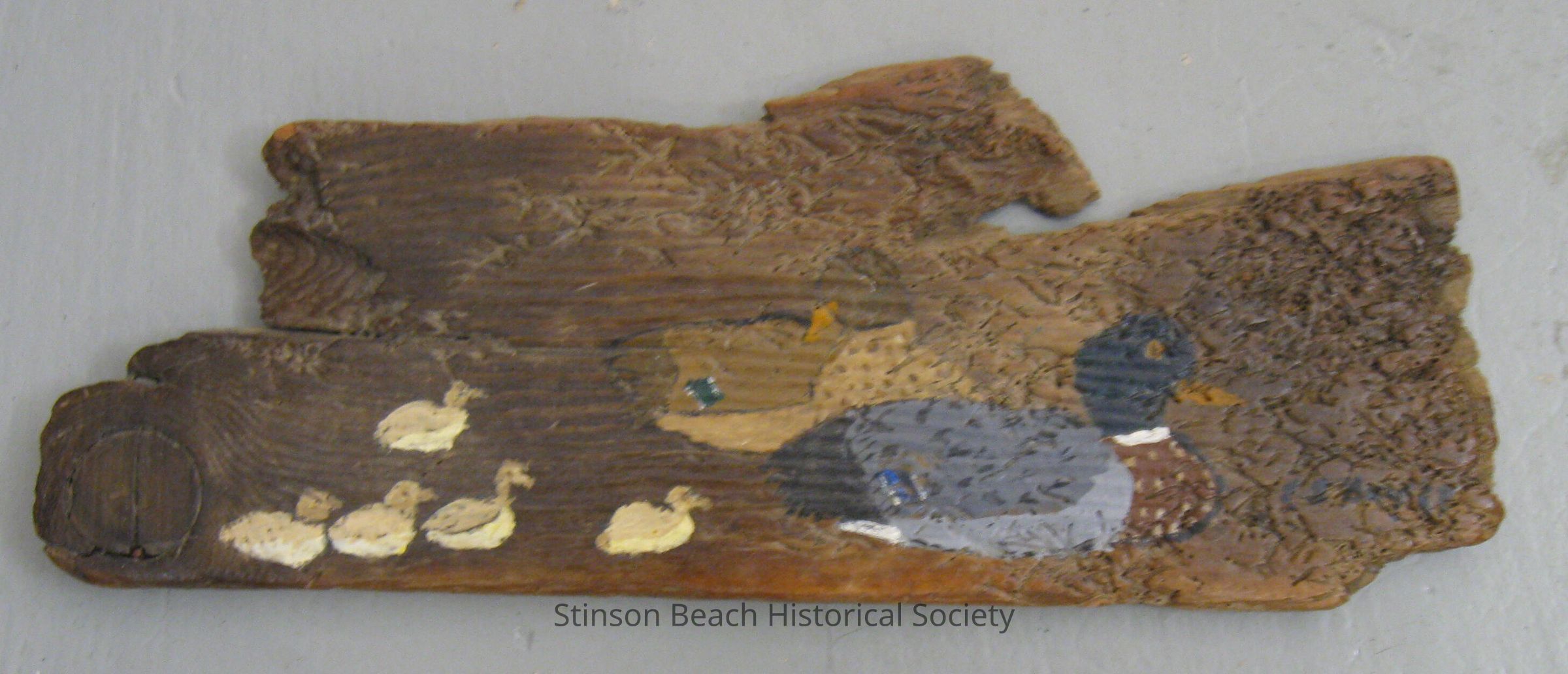 A pair of mallards seemingly drifting on the water followed by 5 yellow ducklings - 4 in a row and one slightly apart and above. The mallard in the front is bluish gray with a black head and tail. Its back is dark gray and mottled, its underbelly is a light gray. Its breast in brown and spotted. There is a blue splotch on the wingtip. The other mallard is 3 shades of brown - darker head and tip of tail, softer back and orangish tan belly and breast. It also had a spotch of blue on its wingtip. S Boyle signature barely visible in blue lower right.Collection