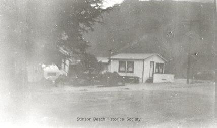 Grayed-out photo of a small house sitting on a rain-soaked road. It sits at the base of the hill separated from another structure and house trailer by shrubbery. A pine tree blocks out the other structure. A telephone pole sits on the corner in front of the house and a dark sedan can be seen parked beyond it.Collection
