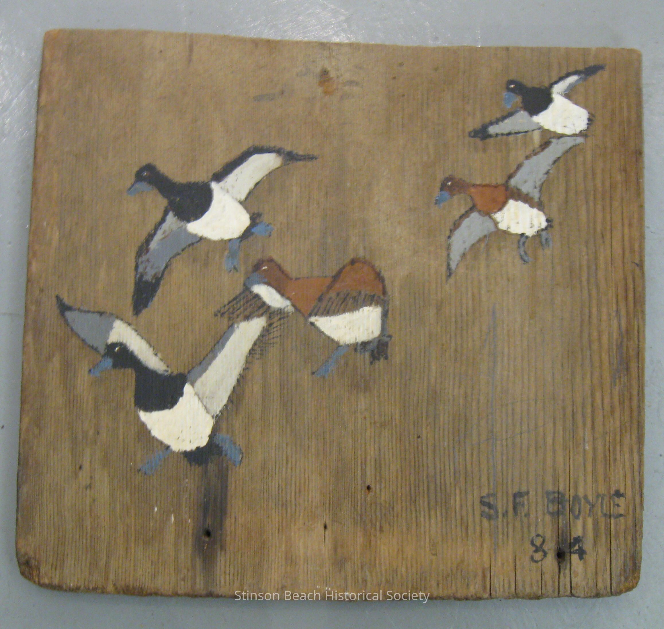 Five ducks in flight in somewhat of a V-shape, all with wings outstretched and all with blue bills and feet. Three are black and white and the other two in the center are brown and white and gray. Signed S.F. Boyle 84.Collection