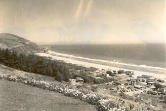 B&W postcard of Stinson Beach looking down from the hillside with the beach/ocean in the distance. A row of flowers (daisies) stretches lengthwise across the hillside where the unknown photographer stands facing south.Collection