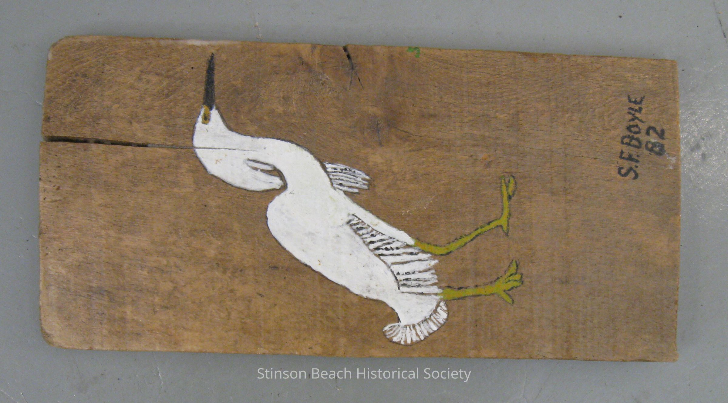 Snowy egret in profile on a rectangular driftwood board. It is standing on yellow legs facing right. It has a yellow eye, black beak. There is a slit in the driftwood at the top that extends down to the egret's neck. Signed S.F. Boyle 82Collection