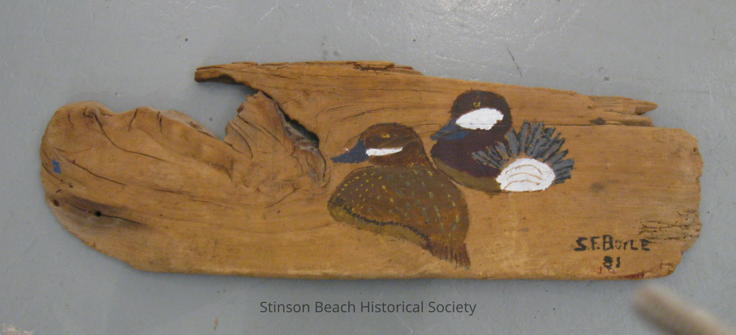 Two ruddy ducks sitting in a nesting position with their heads facing left have their back to the viewer. The duck on the left is brown with a speckled back and a white stripe running out from its blue beak. The duck on the right has a bluish fantail that is sticking up in the air with white beneath. It is otherwise dark brown with a lighter tan underbelly. He has a larger white blotch extending from his blue beak. Both have yellow eyes. Painted on piece of light brown driftwood that is somewhat oval in shape with a piece missing at the top left corner. Signed S.F. Boyle 81Collection