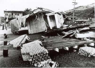 B&W photocopy from slide showing the remnants of Syd Boyle's house on the beach after the 1982-83 storm. Besides being knocked off its frame, parts of the brick chimney a strewn about in the foreground. The shell of the structure tilts precariously with nothing under part of the roof. Wooden debris is scattered about.Collection