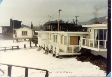 This is a color photograph of waves washing up to and under beach front houses. The dark house in the back at the far left is the Kelly house. The small white house in front of it and to the right is the Barnett house. The long white house in front of Barnett's and running to the right side of the picture is Sid Boyle's house. The dark house behind Boyle's is Walter Selmer's house. The Kelly house and the Boyle house (see #1998-121) were destroyed in a later storm in 1983.Collection