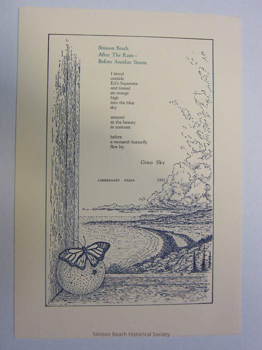 A poem describing the beautiful sky after the rain in contrast to an orange he tossed to the sky. It is illustrated with a view of the beach through a window. An orange with a monarch butterfly on the widow sill. It is printed in blue with green title. Also see 2005OB-101.Collection
