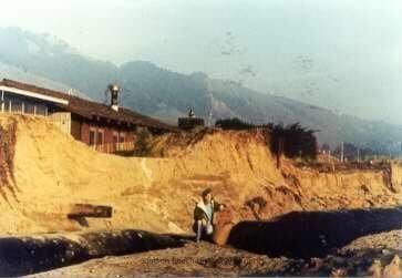 Erma Parsons stands on bended knee, one arm resting on a wooden sign, in front of deeply eroded sand dunes in Seadrift. The upper part of a beach house can be seen above her near the dune edge. A large wooden beam protrudes several feet from the lower part of the dune. Mt. Tamalpais is in the backgroundCollection