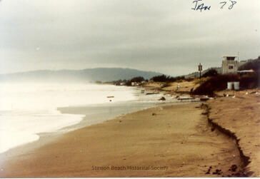 Beach erosion on the public portion of Stinson Beach looking north. The tide is out leaving a foot or two of drop-off in the sand on the southern side of the lifeguard tower. The long view stretches to the residential part of the beach before sea mist obscures the view. The Bolinas peninsula is in the background.Collection