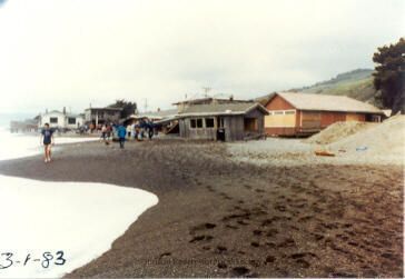 View of the Upton Beach portion of Stinson Beach, looking south at the houses that bore the brunt of the 1983 storm. The first wooden structure sits at an angle on the sand, its windows empty. The red one-story house behind it has its windows boarded up. Beyond is a group of people, perhaps checking out the wreckage of Syd Boyle's house. Further on the houses seem to be in decent shape. Some white surf is visible on the left of the photo.Collection