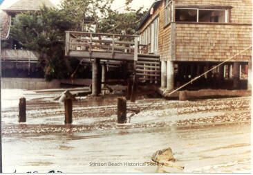 Shingled beach house (south side of Bob Evans house). The house and deck sit on exposed pilings with the ocean rushing underneath.Collection