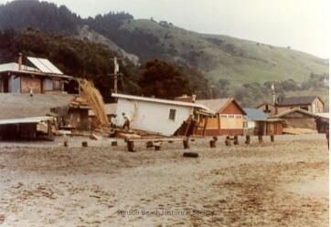 This color photo shows the Sid Boyle house lying on the beach in two halves. One half is at the left side of the picture and shows mostly the gray roof. The other half is to the right and shows the white side of the house with a small window. There are workmen between the two house halves in the process of removing the debris. Behind the house parts is a brown shingle house with solar panels on the roof. This is the house of Barbara Ward. To the right of the broken house is a red house with boarded up windows. This is the Frank Fontes house. Beyond the Fontes house other houses are partially visible. The coastal hills are in the background.Collection