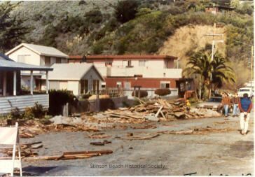 This color photograph is of a paved road with a huge pile of debris pushed over to the side of the road. The debris consists mostly of lumber from damaged and destroyed houses.Collection