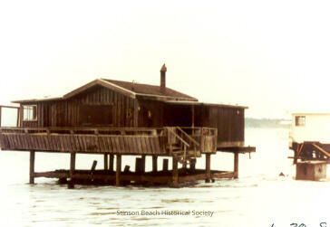 A one-story wooden beach house sits on crumbling pilings surrounded by water. I believe this is the Kugelgen residence, which was washed out to sea.Collection