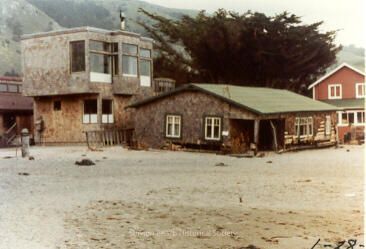Shingled beach house with green roof collapsed on the sand so that it appears half buried. Two-story square wood and glass house is behind it; a red 2-story house sits beyond it. This is in the Calles.Collection
