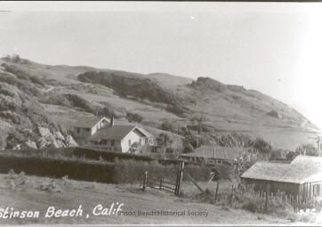 This black and white photograph is a copy of a postcard. It shows a rectangular hedged in area behind which is a white house with a partial second story. To the right of the white building a rooftop is seen and on the right side of the photograph is a small one story building fronted by a wire fince and a gate. Behind the bulidings the coastal hills can be seen. The buildings are located in the area of Laurel and Buena Vista.Collection