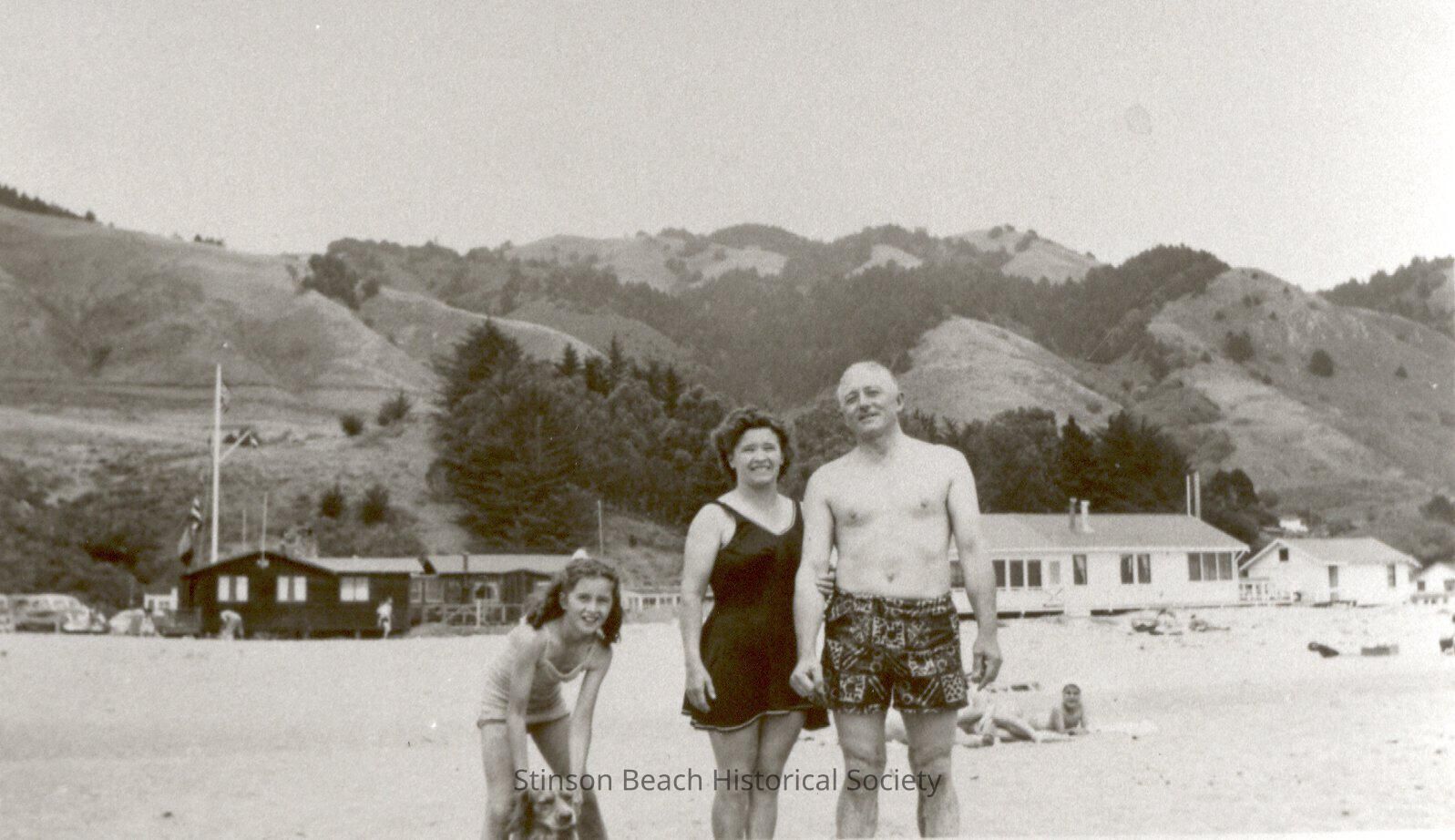 B&W photo of a middle aged couple in swimsuits holding hands and standing on the beach a distance down from some beach houses in the background. With them is a young girl, also in swimsuit, who is bending forward to hold her dog's head toward the camera. The family is identified as Rosalia with dog Bolito and Natalina and Arthur Sessie (?).Collection