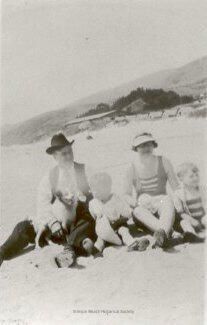 Couple with two small children and one small dog sitting on the beach with rooftops of houses in the dunes behind them. He wears a black top hat and regular clothing, she a light sun visor and swimsuit. The children are in sunsuits.Collection