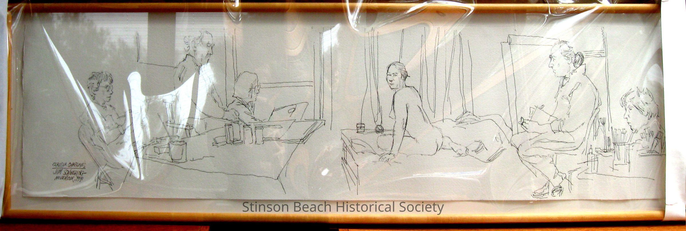 Ink drawing of a figure drawing class. A nude model sits on a bed in the center. Five artists are sketching her: a pony-tailed man sitting on a stool with a sketch pad and a person behind him sitting next to a table with paintbrushes in glass jars are on the right; on the left side a man on a stool is using a table in front of him to hold his sketch pad as he draws and 2 women on either side (both are wearing glasses) are sitting in chairs holding their sketch pad. This table also has several glasses on it but nothing is in them.Collection