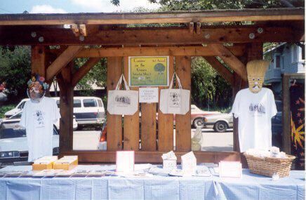 The Historical Society Booth at the May 9, 1997 Cuisine on the Green. On display behind a long table with printouts and cards are canvas bags hanging from a section of wooden fencing and on the left and right t-shirts topped by a broomhead with eyes, nose and moustache (R) and a floral wreath with a female head in its center.Collection