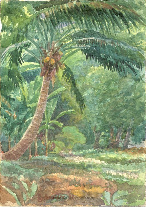 A watercolor painting of a very lush green landscape with a coconut tree in front and banana plants and green trees on the background. The painter's signature, Schneider '31, is painted in a brown-orange tone on the lower center of the painting. On the back of the painting, written in pencil, is "Schneider - Stinson Beach Artist - Nina purchased his house after his death." Nina is probably one of the Pepper family who still owns the house and who also owned house next door down the hill. It is framed in glass with clips. On the back of frame, a 3x5 card is attached with the note: Original Watercolor by ..... Schneider ca.1931 signed. Gift to Helen Bever, she gave it to her son Barney Bever who donated it to the Stinson Beach Historical Society on 4/10/09.Collection