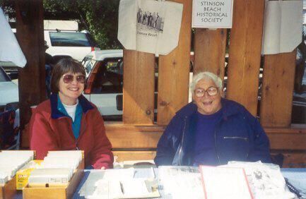 Seated at the Historical Society table at the May 9, 1997 Cuisine on the Green are Jane Slack (L) in tinted sunglasses and wearing a red jacket over a blue shirt and white t-shirt, and Nancy Sullivan (R) who has untinted glasses and a wide open smile. She is in a dark blue windbreaker over a purple sweatshirt. There are a lot of papers, cards and a sign-up sheet on the table. Posted behind them is a square STINSON BEACH HISTORICAL SOCIETY sign and a canvas bag with surfers+Stinson Beach printed on itCollection