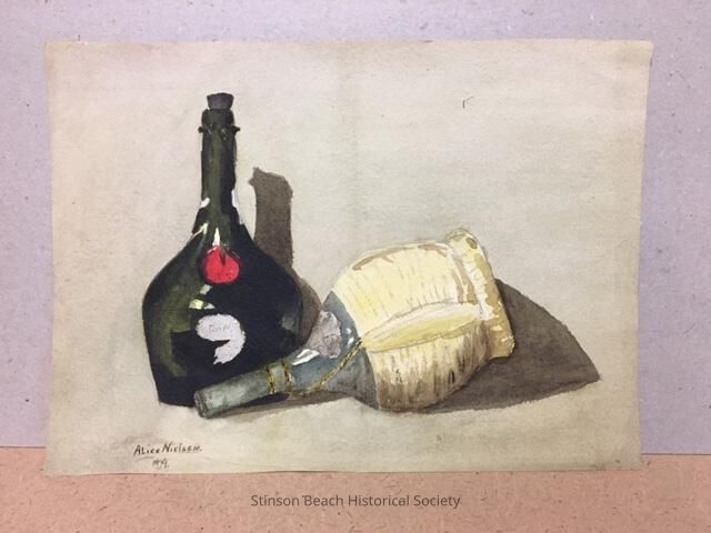 Watercolor of wine bottles, an upright black one and a gray one in straw basket on its side. The name Alice Nielsen is written in the bottom left corner with #09 underneath. On the back is the name of Alice N. Smith. The Nielsen family were the owners of the "Laffalot," in the early 1900s and was located at 1 Belvedere.Collection