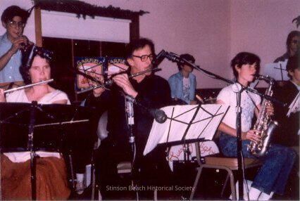 A color print from a slide in our collection of the Tuesday Night Band rehearsing for the Firemen's Ball in 1984. From the left: Agnoli, Vasco/Crandall, Harriet/Agnoli, Valentino/Abbott, Nick/Crandall, John. The Tuesday Night Band was created by David Murray who was the musical instruments teacher at Bolinas Stinson School and the director and conductor of the West Marin Community Chorus and Orchestra in 1980. It consisted of the students, parents and other interested adults. It practiced on Tuesday nights. It was disbanded when David and his wife Susan moved to San Diego in 1986. It performed at local fairs and holidays.Collection