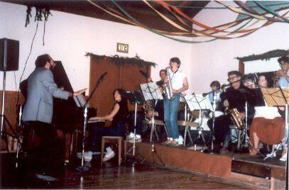 A color print from a slide in our collection of the Tuesday Night Band rehearsing for the Firemen's Ball in 1984. From the left: Murray, David/Jennifer,--/Murray, Susan/Crandall, John/Abbott, Nick/ Agnoli, Valentino/Crandall, Harriet/Agnoli, Vasco. The Tuesday Night Band was created by David Murray who was the musical instruments teacher at Bolinas Stinson School and the director and conductor of the West Marin Community Chorus and Orchestra in 1980. It consisted of the students, parents and other interested adults. It practiced on Tuesday nights. It was disbanded when David and his wife Susan moved to San Diego in 1986. It performed at local fairs and holidays.Collection