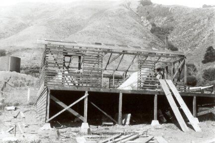 B&W photo that shows the first stages of framing in a 2-story house (or one-story with an understory) at the base of a sloping hill. On the right side, two long planks rest between the upper floor and the ground.Collection