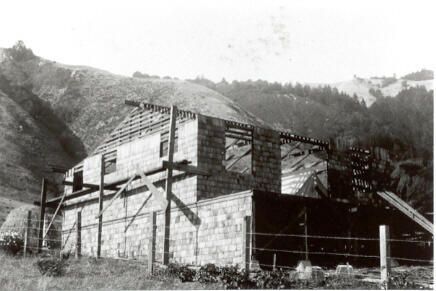B&W photo of almost completed shingled house sitting at the base of the hill. Lower levels are finished, at least on one side. Roof is still open but beamed. It is separated from the surrounding area by a wood and wire fence.Collection