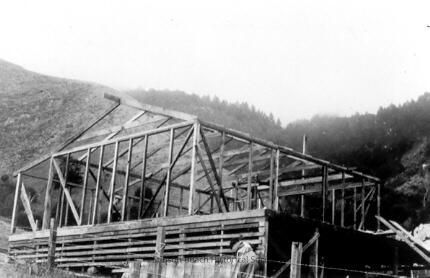This black and white photograph is of the framework of a house under construction. It is taken from below looking up at the upper story and roof with the hills behind showing through the framework. Image 2 is of the album page containing the picture.Collection