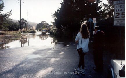 This color photograph is of the same street as the previous two but the camera is located farther down the street beyond the flooded area, showing wet, but not submerged, pavement in the foreground. A woman and a man are standing in the right foreground looking down the road where the yellow truck is approaching through the water. The woman, with long hair and wearing a white shirt , is Mrs. Fox. The man on her right, in dark clothing is Dick Kamienici.Collection