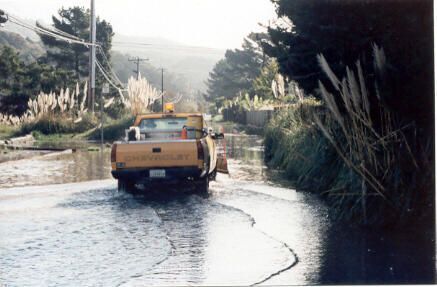 This color photograph is a close up of the yellow pickup truck in the previous photos. The truck is traveling through the water in the other direction (away from the camera). It has a yellow roof light, cones in the back and the edge of a plow blade can be seen protruding from the front of the truck.Collection