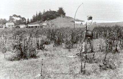 In a weedy hillside field overlooking the ocean, and a short distance from a grassy knoll with 3 or 4 structures at its base, a man (with back to camera) stands with a large bow pulled back and aiming at something in the distance. He wears additional arrows in a quiver at waist level.Collection